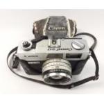 A camera case containing a JENAFLEX AM-1 body with a CARL ZEISS JENA DDR 1:1.8 lens with instructions. Body and lens in good order. Also a CANON SureShot.