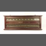 A wonderful antique billiards scoreboard, uncleaned brass sliders all complete, glass over gold lettering has kept this in good condition measures 92x34cm. A well-made piece