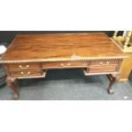 A low wooden desk with central drawer, 2 sets of 2 side drawers all on ball and claw feet. Approx 160cm wide, 80cm deep and 76cm tall