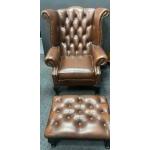 NICE QUALITY! A deep buttoned brown leather winged armchair with footstool