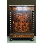 An exquisite lacquered cabinet with inlaid marquetry and marble top which may be a later addition. A hand-written maker's mark is written under the marble. Barley twist pillars adorn the sides finished with bun feet. A gorgeous inlaid detail of wood and bone beading surrounds the top edges (some pieces detached some of which are stored within the cabinet). Comes supplied with the key. H115cm x W80cm x D40cm approx. A stunning piece possibly of French origin