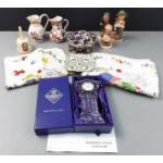 A small decorative ornamental lot to include three GOEBEL style Hummel figures and a bell, two MASONS jugs, and an Edinburgh Crystal clock in box etc.