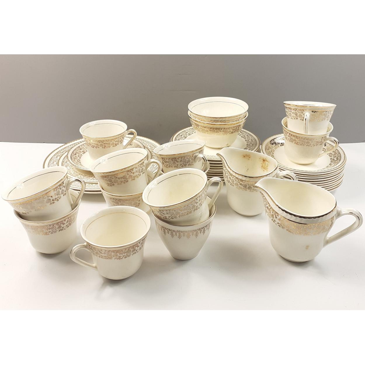 A PORTLAND POTTERY tea set in cream and gilt to include two large (23cm) sandwich plates, 11x17cm side plates, 12 saucers, 12 cups, 2 sugars and 1 cream