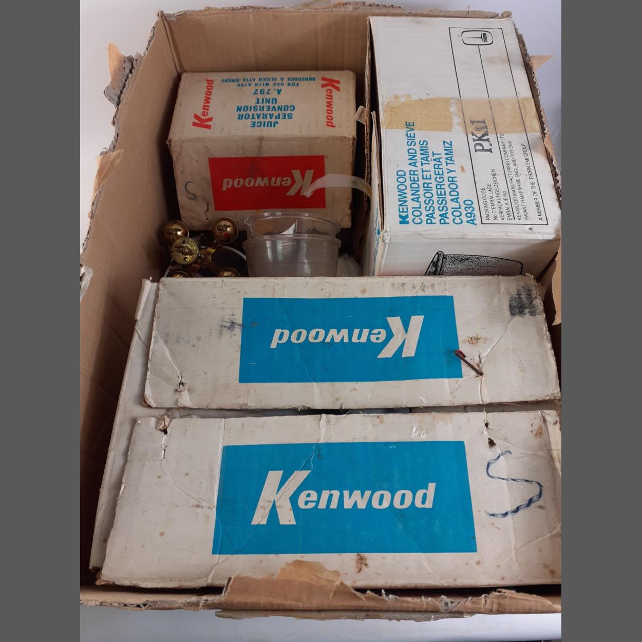 A mixed lot of Kenwood Kitchen appliances to include a colander and sieve, a shredder and slicer together with various attachments such as beater and whisk among other items.