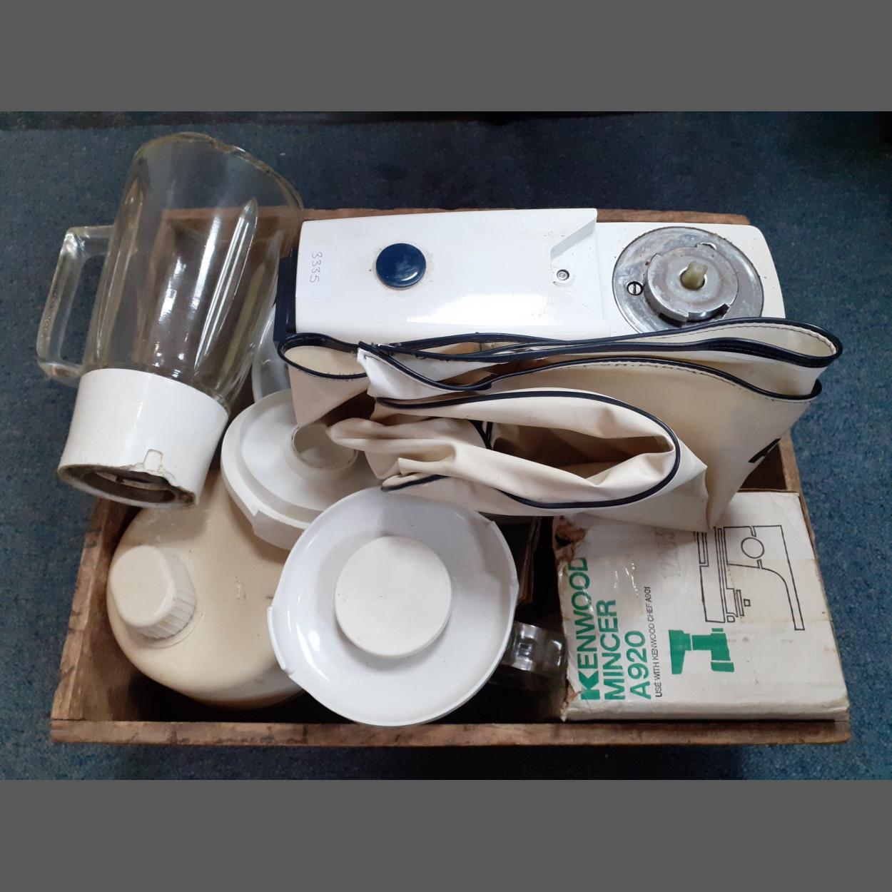 A collection of Kenwood Kitchen appliances to include a mincer, mixer machine and two glass blenders.