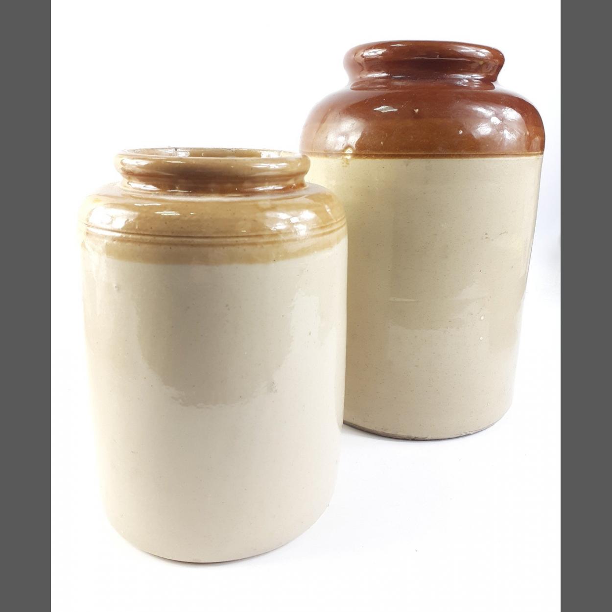 A pair of STONEWARE JARS with a small hairline in each jar. Large jar is approx. 18cm in diameter and 28cm in height. Smaller jar is approx. 14cm in diameter and 21cm in height.