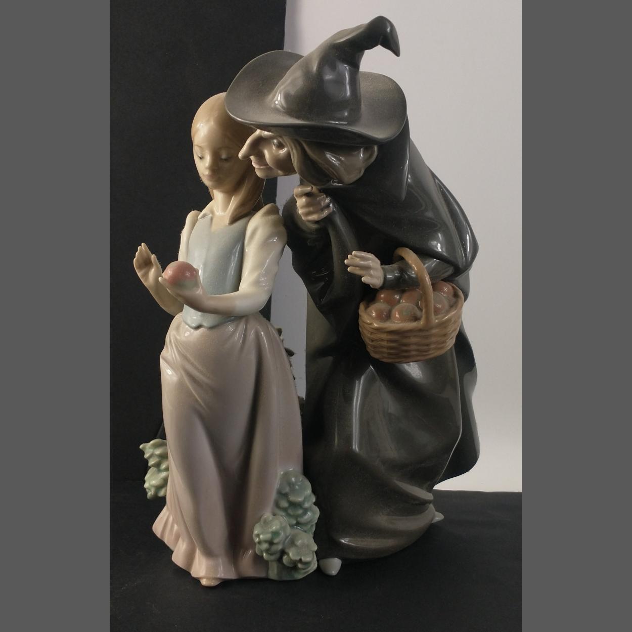 An expressive LLADRO figurine group of a young girl being offered an apple by an elderly woman in witch's hat. Nr.:E-21 F / 33. Approx. 26cm in height. In excellent condition.