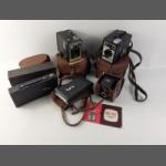 A collection of 5 VINTAGE CAMERAS including a KODAK 2A Folding Autographic Brownie with (damaged) box; a ROSS ENSIGN FUL-VUE SUPER camera with damaged case and manual; a KERSHAW EIGHT 20 PENGUIN with case; a KODAK BROWNIE SIX 20 MODEL D with case; a REX FLASH box camera with case, and a leather camera case without camera.
