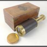For LOVERS of THE SEA! A beautiful extendable brass telescope with wooden carved box inlaid with the anchor and rope symbol. In excellent condition. Telescope measures approx. 3.5cm in diameter and 9cm closed and 12.5cm extended.