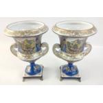 A pair of twin-handled pedestal urns with metallic feet in blue with gilt highlights each standing approx 17cm high with a pastoral scene, maker's mark of crossed swords to base, no visible damage