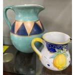 Two beautiful hand-painted and elegantly shaped jugs. The larger jug is approx. 20cm in diameter and 22cm in height painted in Kabul Green, dark blue and light terracotta. The smaller jug is of Italian origin and measures approx. 15cm in diameter and 12cm in height.