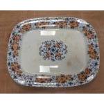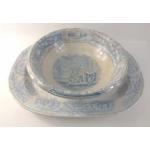 A large METHVEN & SONS Verona pottery basin with classical blue and white design 36cm dia x 13cm high with an exceptionally large salver (no maker's mark) with Oriental design 52cm x42cm. A few small chips on the under lip of the bowl do not detract from this aged item.