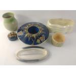 A mixed ceramics lot to include an unusual CARLTON WARE pot in cobalt blue with gilt highlights 27cm dia approx, plus a DEE CEE mantel vase, and a GRAY'S POTTERY hand-painted vase(18cm high) and other pottery vases etc. NB. The Carlton ware pot has a small rim chip underneath not visible from the top. The Gray's pot has a minor bottom rim chip.