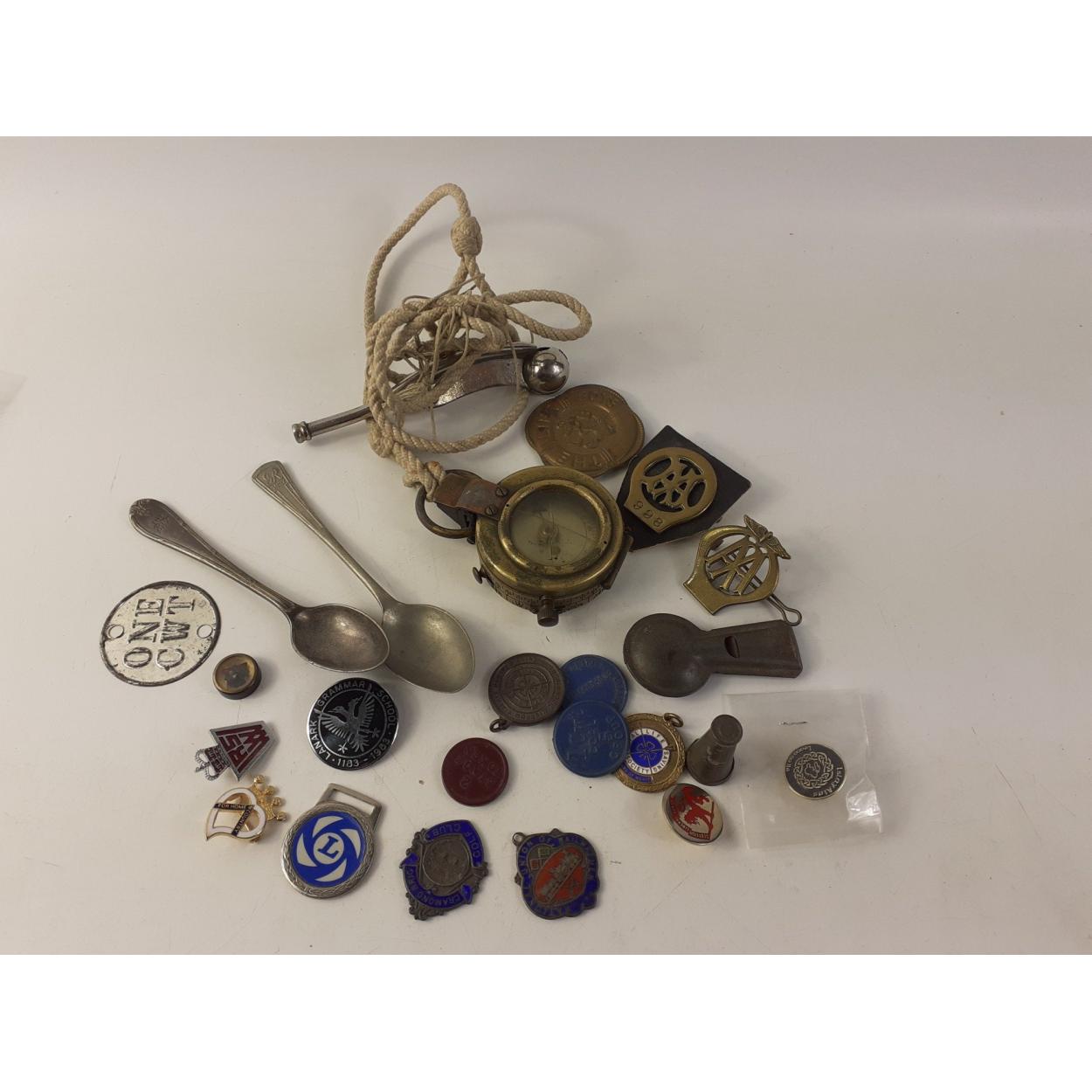 INTERESTING! A small collection of miscellanea and items of interest. A brass hand held compass with mother of pearl face (glass lid cracked) Bosun's whistle, commemorative spoons, badges including AA brass badge and others. An interesting lot.