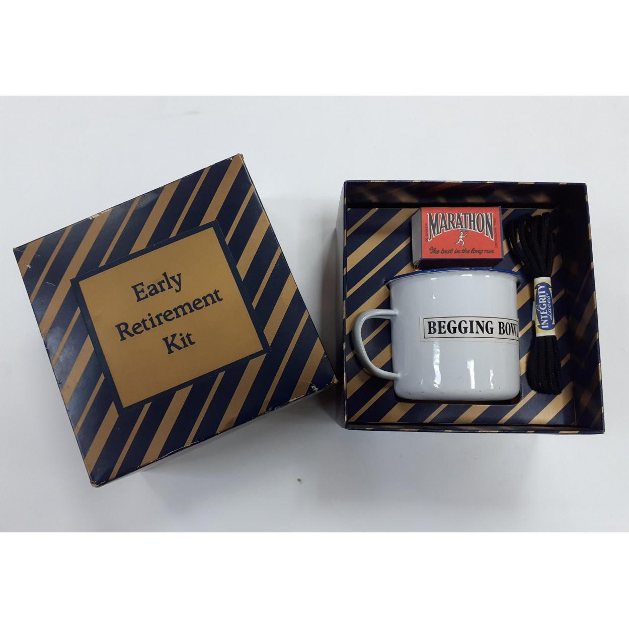 A TONGUE-IN-CHEEK lot for imminent RETIREES! An EARLY RETIREMENT KIT in original box to include a Begging Bowl, a box of Marathon - The best in the long run - matches and a pair of Integrity Shoe Laces. Happy Retirement!