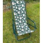 A handy garden relaxer fold-away seat with a leafy-green cloth fabric