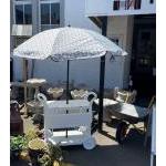 HERE COMES THE SUMMER! A brand new patterned garden parasol - can adjust height etc - this does not include the super drinks cart but if interested in it speak to the auctioneer after the sale!