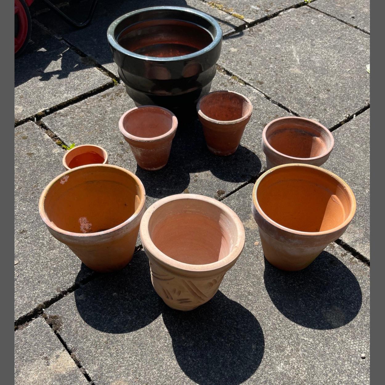 Add colour to your patio with these seven various sized TERRACOTTA pots plus a larger plastic pot.