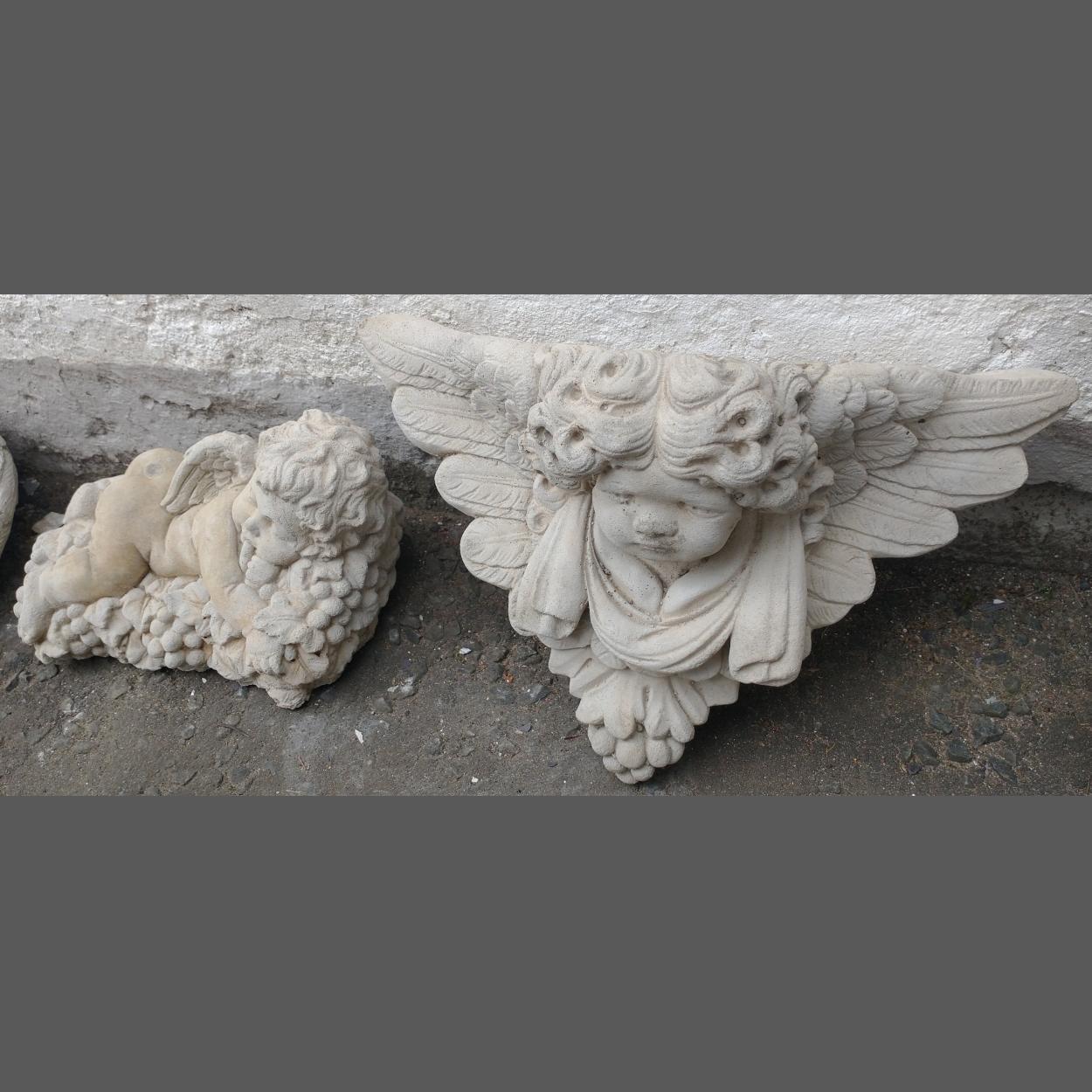 Two cherub garden ornaments to include one lying on grapes (30cmL) and a wall hanging cherub planter (40cmL) - brand new items