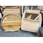 AUTHENTIC FARMHOUSE - Two RUSTIC ANTIQUE wooden construction butter churns, one with a churning handle, paddles intact and lid intact, the other without - dimensions for the largest one 55cm height x 50cm width x 40cm depth approx