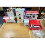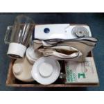 A box of kitchen ware to include a YOUR KITCHEN candy floss maker, a MOULINEX chrono jet iron, a DOLE YONANAS ice cream maker and a handheld GARMENT STEAMER plus materials for silk painting