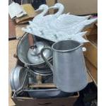 A kitchen lot to include 3 various sized roasting tins, an unvarnished wooden coat rack 45cm long, a white painted swan coat rack 50cmLx 28cmH, a large soup pan 33cm dia (no lid), two jelly pans (30cm and 32cm dia), a large aluminum kettle and a large jug 21cm tall