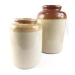 A pair of STONEWARE JARS with a small hairline in each jar. Large jar is approx. 18cm in diameter and 28cm in height. Smaller jar is approx. 14cm in diameter and 21cm in height.