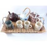 A TEA-FOR-TWO OR THREE OR FOUR collection to include a wicker-woven tea tray measuring approx. 52cm in length x 36cm width x 6cm in height, 2 x "Dutch Art at the National Gallery of Scotland" mugs, a stone pottery mug, and a ceramic container with bird and snails printed (approx. 9cm in height x 8cm in diameter) and 3 types of teapots including a square "house" teapot design.