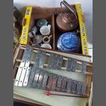 A mixed lot consisting of a boxed vintage xylophone, a copper kettle and some mixed china.