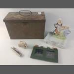 A mixed box to include a YARDLEY English Lavender soap dish, a vintage metal tin (26x12x17cm), a small soapstone elephant, a double picture frame (2"x2") surmounted by garden creatures, and a large metal note clip