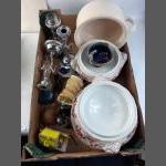 A mixed lot to include Royal Staffordshire Pottery comprising of 5 "KIOTO" patterned soup plates and two matching vegetable tureens (approx. 22cm and 20cm in diameter), a chamber pot, white metal figurine candlesticks, ebony elephants, carved stone tortoise, ceramic "Wagon" toast holder and a Maling footed bowl among other items.