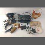 A small mixed lot to include a 12V x 250 PSI Air Compressor with lead for plugging into car cigarette lighter, a REVUE 250BS 35mm camera, a vintage AGFA ISO-RAPID Parator camera and various decorative items