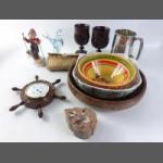 A mixed lot of decorative items to include two African wooden goblets, a ship's wheel thermometer, a Sheffield pewter tankard, a glass bird, a cloth sewing kit, a leaf-shaped stone box, a ceramic child skier, 2 ceramic bowls, 1 wooden bowl, 1 green ceramic owl and a brass owl.
