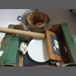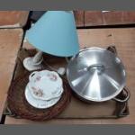 A mixed box to include a table lamp with blue shade, large aluminium soup pot and a shallow wicker basket