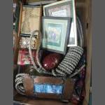 A mixed lot to include a raw silk scarf approx 140cm, a hank of rope, 3 Heroes of the Sky decorative plates including a Lancaster, Spitfire and Hurricane, a ROYAL DOULTON Old Charley (D5527) Toby jug, various artworks, a small wooden box decorated with seashells (11x6x7cm) with small quantity of costume jewellery etc