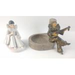 A PIERROT pottery clown figurine 12cm height approx with a mandolin playing Pierrot figure sitting on a bon bon dish in heavy marble - diameter of dish 11.5cm x 11cm height approx