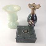 A small collection to include a black and white veined marble box with lid approx. 11cm square x H4cm; an opalescent stone-like goblet approx. 11cm in diameter x H11cm, and a brown and beige vase with Maltese Cross approx. 8cm in diameter x H15cm.