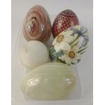 A small collection of decorative eggs to include a hand-made ST PETERSBURG, Russia red glass with gilt egg, an EGGZAKLY of Selah USA, porcelain and 3 other marble eggs