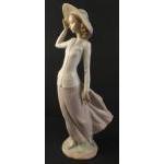 An attractively svelte LLADRO female figurine being blown by the wind. Handmade in delicately timeless pastel colours. No.:5682 / P28J. Approx. 31cm in height. In exellent condition.