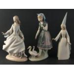 A collection of LLADRO figurines with slight damage. An endearing LLADRO figurine depicting a young girl herding two ducks (one of the duck heads has been damaged and re-glued). Otherwise in very good condition. No.: B-5 S. Approx. 28cm in height together with an expressive LLADRO figurine of a Cinderella-like young woman running away and losing a shoe. Slight damage to the index finger on the right hand, otherwise in very good condition. Approx. 26cm in height together with a female figurine of a Fairy-Godmother-like woman with tall magical hat. Slight damage to her right hand, otherwise in good condition. Approx. 28cm in height.