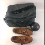 A set of four DRAKE'S PRIDE Professional Bowls size 5M in a carry bag. Also a pair of size 9 brown leather bowling shoes.