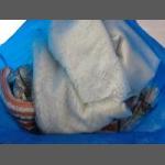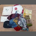 A small box full of silk scarves and various linens to include 2 packs of 4 new napkins, 2 cotton and crochet Christmas embroidered cushion covers and many other embroidered items