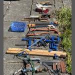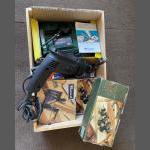 A super box of power tools containing BOSCH PST50A Jigsaw, Black & Decker BD163V drill, RECORD Mitre cutting cramp, MARPLES M148 dowelling jig with accessories and others.