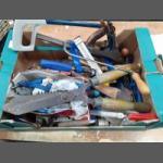 A box of assorted tools and household items to include an axe, a plane, shears, files, wire brushes and much else. A great rummage lot.