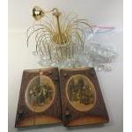 A brass effect chandelier ceiling lamp with attractive glass droppers. Approx 40cm across. With two unusual painted wooden wall plaques.