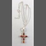A 925 stamped SILVER chain with an indistinct stamped white metal and amber cross pendant