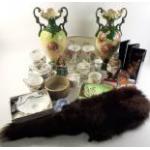 A mixed box to include many quality evening bags, several bottles of scented talc, a SYLVAC wall-mounted flower vase, a carved African soaptsone figure, 2 pairs of shoes etc