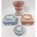 Two pieces of square Wedgwood Jasperware with lids, one piece blue and the other terracotta.[10cm square x 5cm deep ] and one circular blue piece and also a small Terracotta Jasperware vase 12cm tall