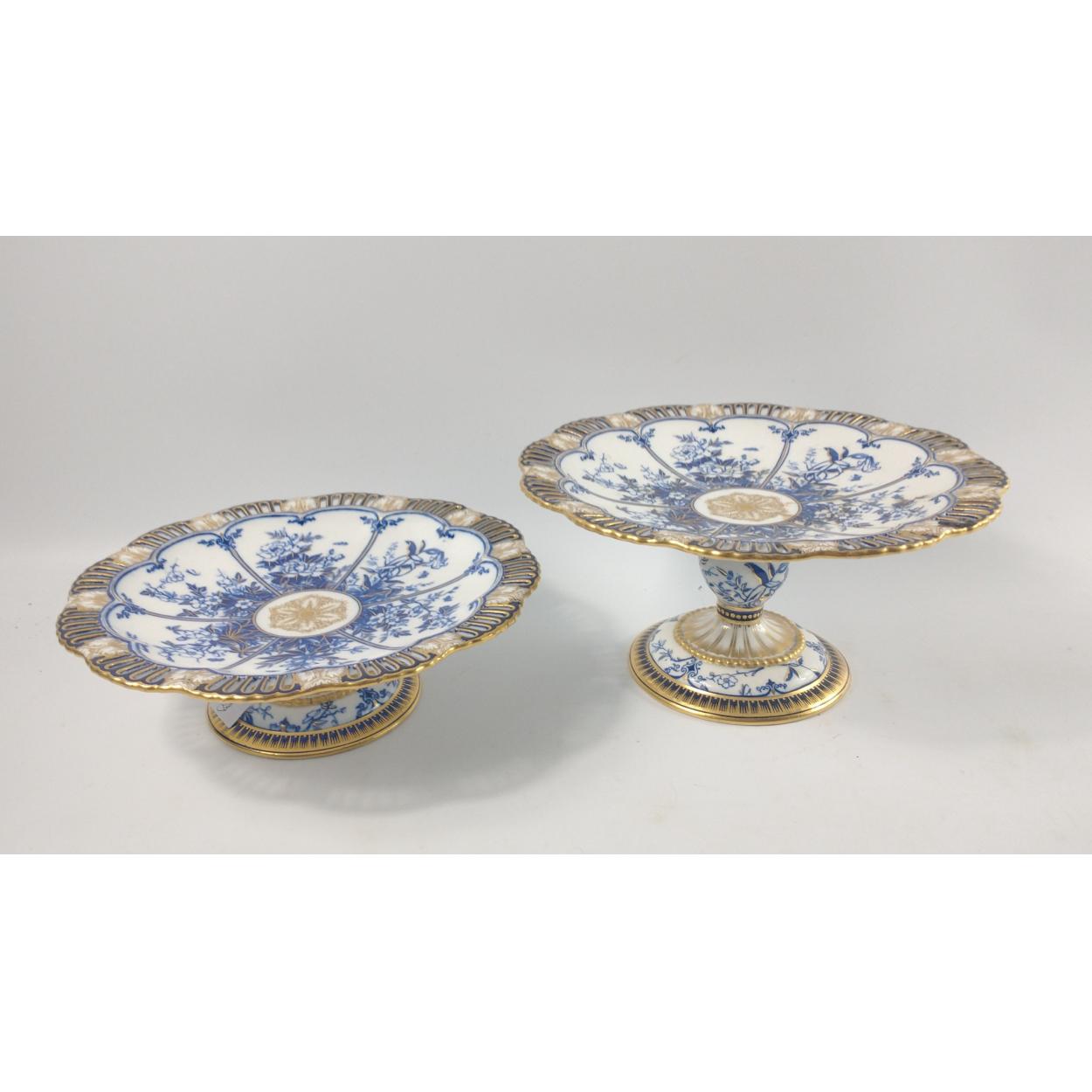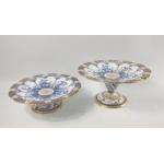 Two ANTIQUE Tassa's with blue and white and gilded design . 1@ 8cm high x24cm diam. the second being 12cm high and 25cm diam. [ the 12 cm dish has been repaired.]