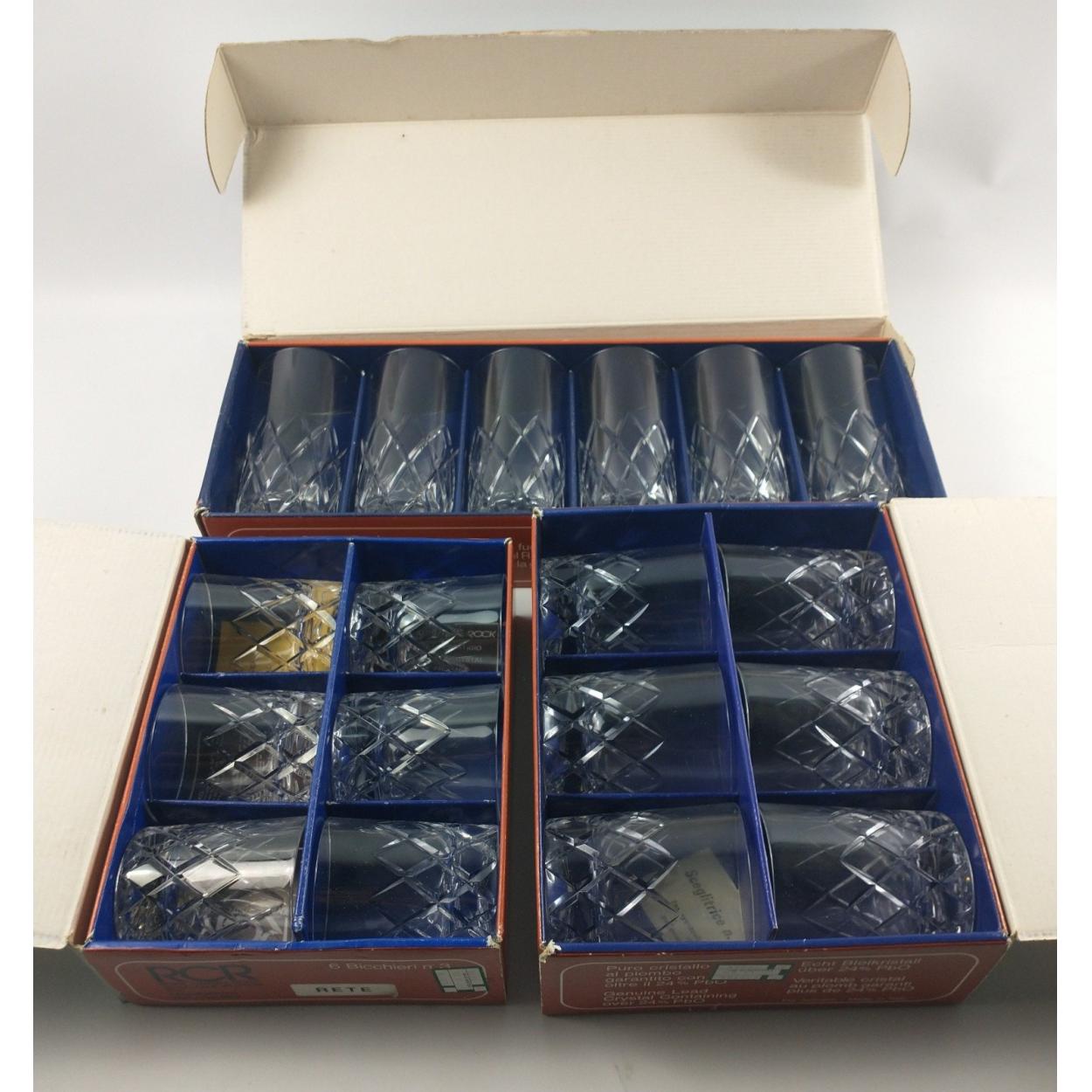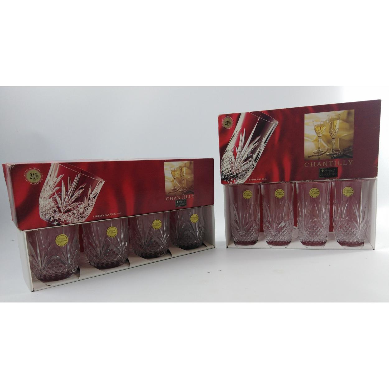 CRISTAL de FRANCE CHANTILLY set of 4 boxed lead crystal whisky tumblers, and also a boxed set of four drinking glass tumblers - both unused and in mint condition including original manufacturers labels still on them all!